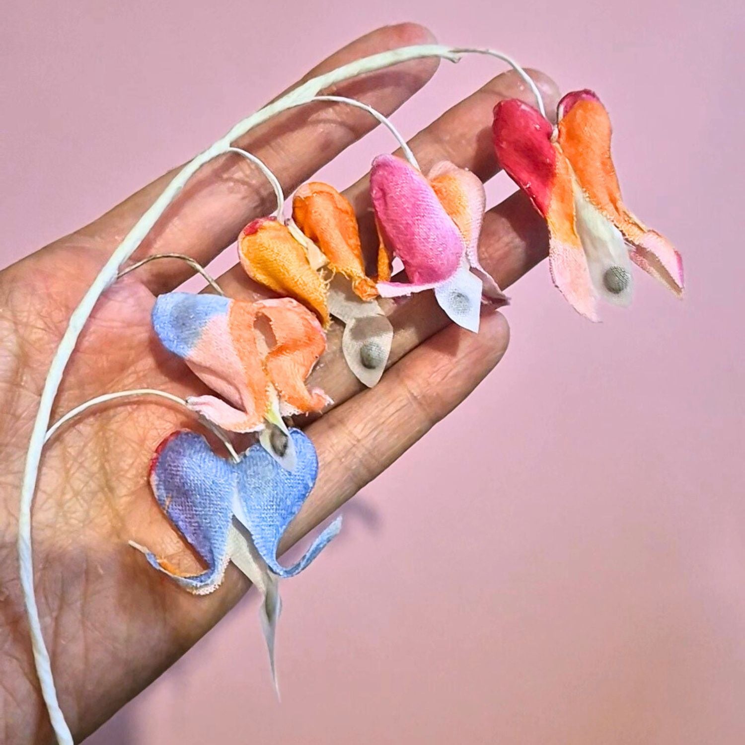 Chaque fleur est entièrement créée à la main, pétale par pétale, à partir de chemises soigneusement sélectionnées et récupérées, dans une démarche écoresponsable. Il faut environ 6 heures de travail pour en créer une seule. Les cœurs pendants sont en intérieur de cravate et encapsulent une lentille du Canada — toujours dans une démarche écologique, pour ceux qui ont vu le reportage d'Hugo Clément sur les lentilles canadiennes et les pesticides.