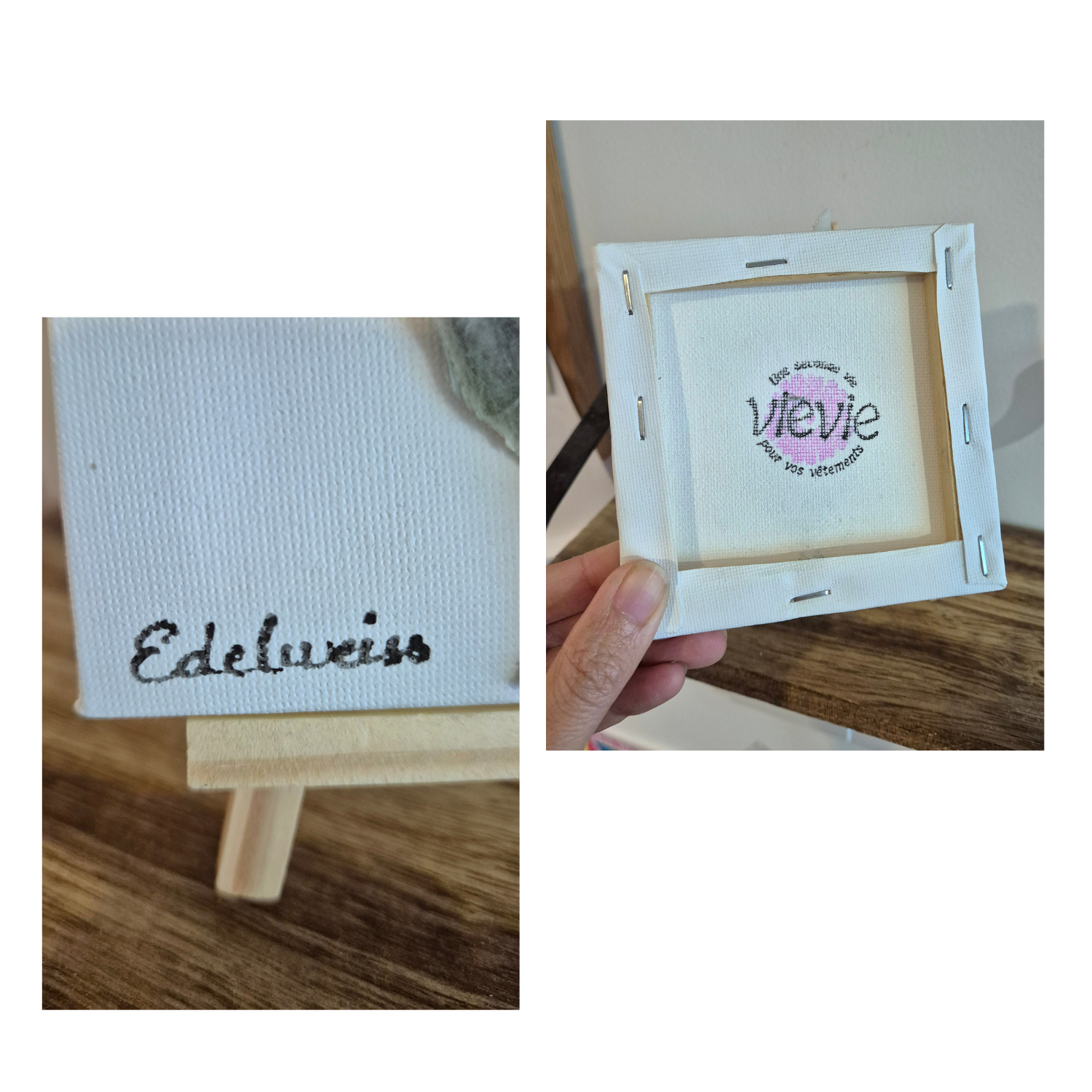 Le nom "Edelweiss" est calligraphié à la plume et à l'encre directement sur la toile, ajoutant une touche d'authenticité à cette œuvre textile.